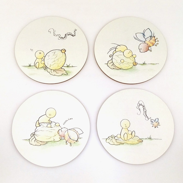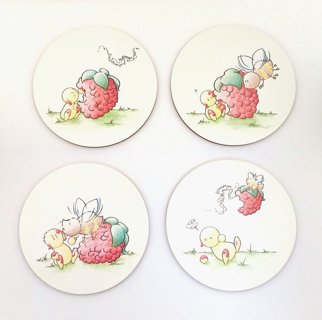 Auf Birkenholz gedruckt, erzählen die Getränkedeckel in jeweils vier Zeichnungen von der ersten und zweiten Begegnung zwischen Lipami und SummBrumm.